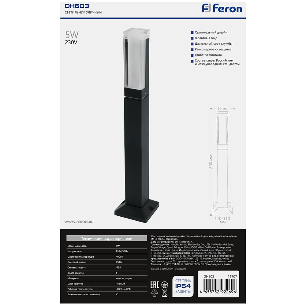 Уличный светодиодный светильник FERON DH603, 5W, 250Lm, 4000K, черный, 11707