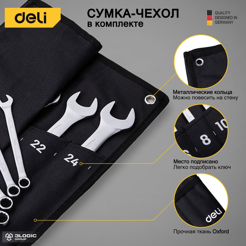 Набор комбинированных гаечных ключей DELI 6-24мм/12шт DL130012A Сталь 40Cr, чехол из ткани oxford 98321