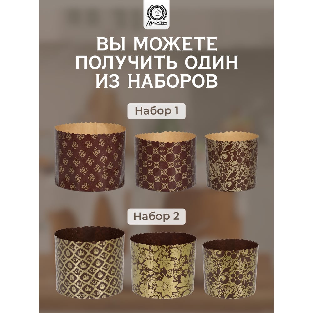 Набор бумажных форм для выпечки куличей MARMITON Пасхальный, 3 шт., 0.5 л 9x9 см, 1 л 11x8.5 см, 1.25 л 12.5x10 см, дизайн в ассортименте 17654