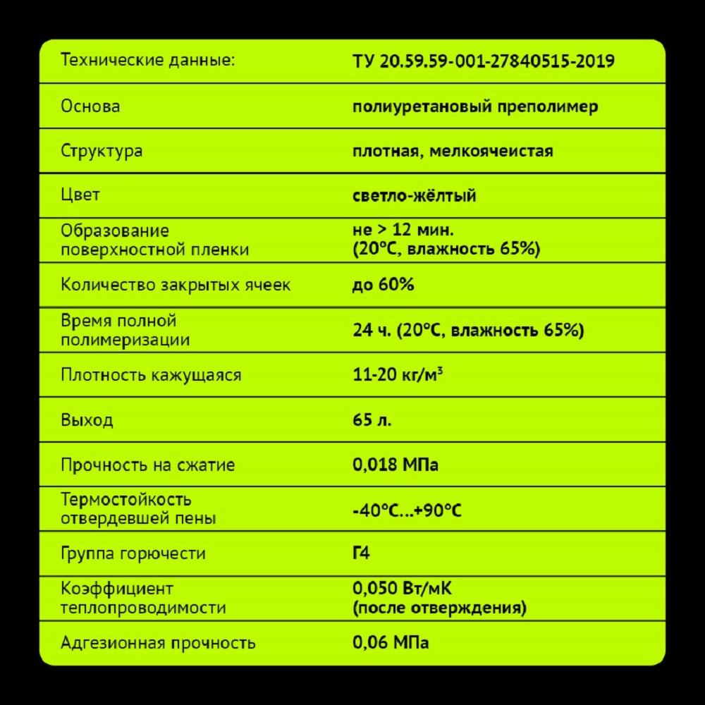 | Объем пены в баллоне (выход) | 65 л |