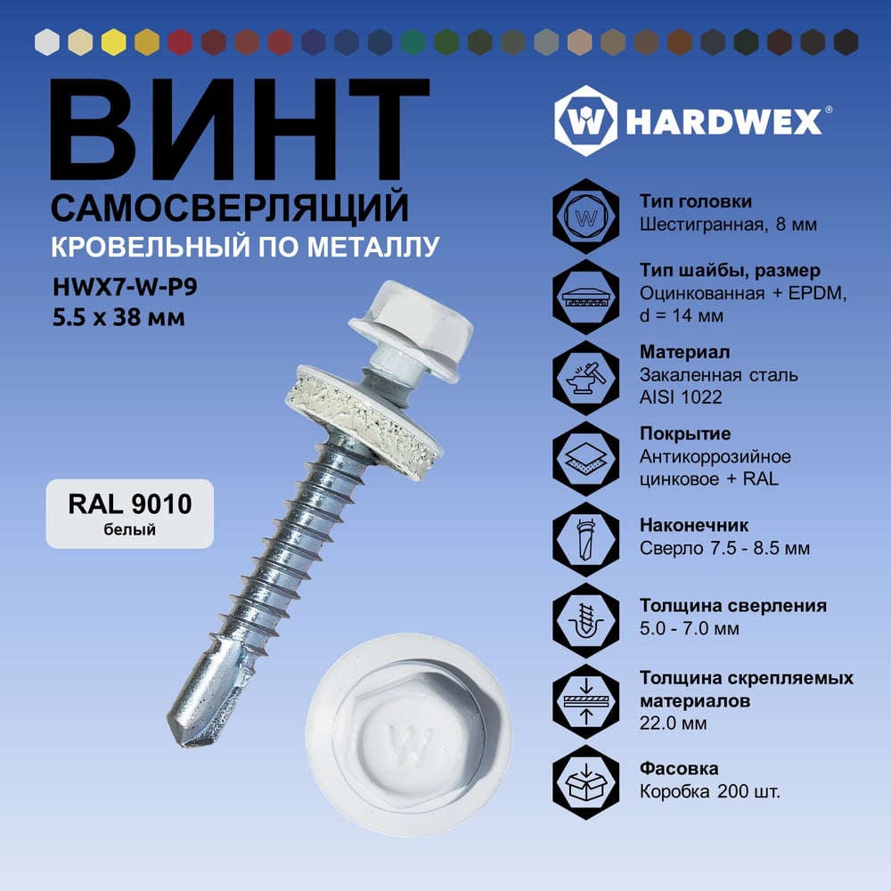 Саморез кровельный по металлу HARDWEX ТМ HWX7-W-P9-5.5x38 мм, св.№3, RAL 9010, 150 шт. 5190000240362