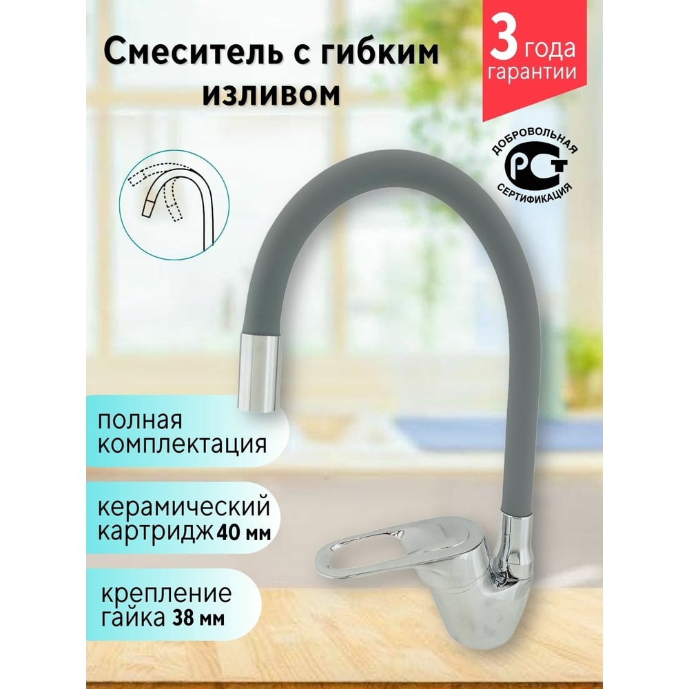 Смеситель для кухни Rainsberg с гибким силиконовым изливом, серый R3193F-5
