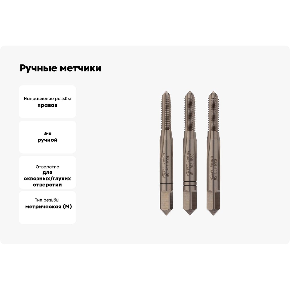 Ручные метчики VOLKEL M5 шаг 0.8мм DIN 352 HSSE комплект из 3 штук V57334