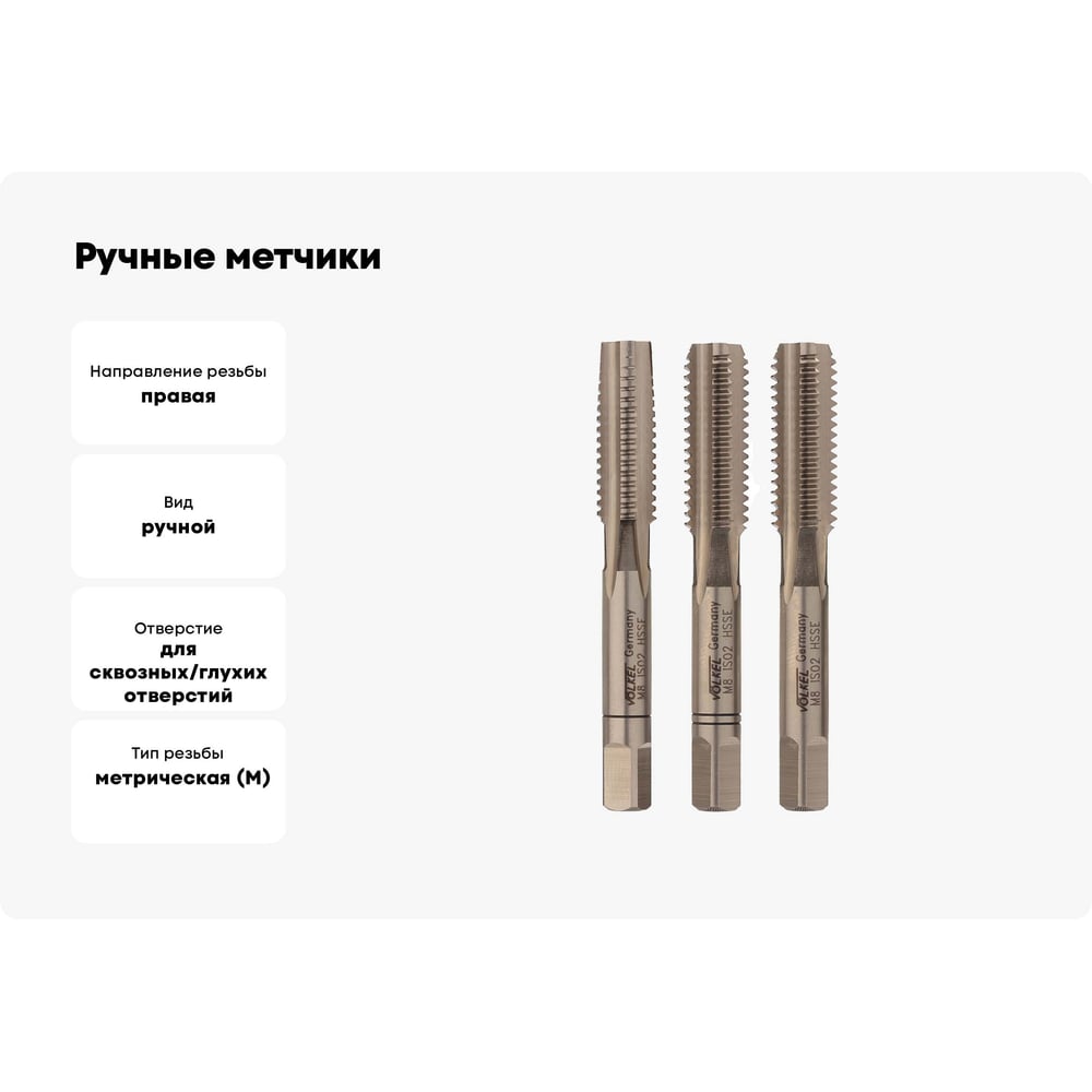 Ручные метчики VOLKEL M8 шаг 1.25мм DIN 352 HSSE комплект из 3 штук V57342