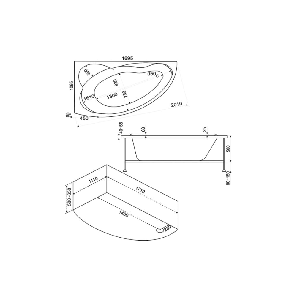 Ванна BAS Лагуна левая, 1700х1000, каркас, комплект д/с В 00019