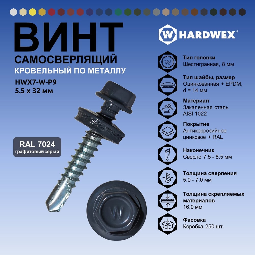 Саморез кровельный по металлу HARDWEX ТМ HWX7-W-P9-5.5x32 мм, св.№3, RAL 7024, 200 шт. 5190000240003
