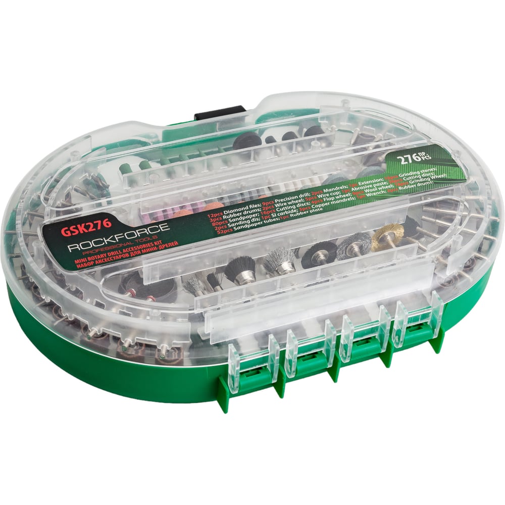 Набор аксессуаров для мини-дрелей Rockforce, 276 предметов, в пластиковом кейсе RF-GSK276 (29219)