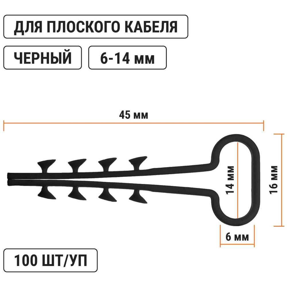 Тип фасовки шт. Материал нейлон Цвет черный Тип дюбель-хомут Фасовка 100 шт Метиз в комплекте нет Вид дюбель-хомута для плоского кабеля Размер плоского кабеля 6х14 мм