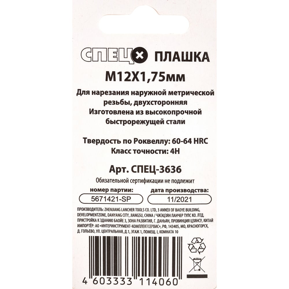 Плашка Спец М12x1,75 мм СПЕЦ-3636