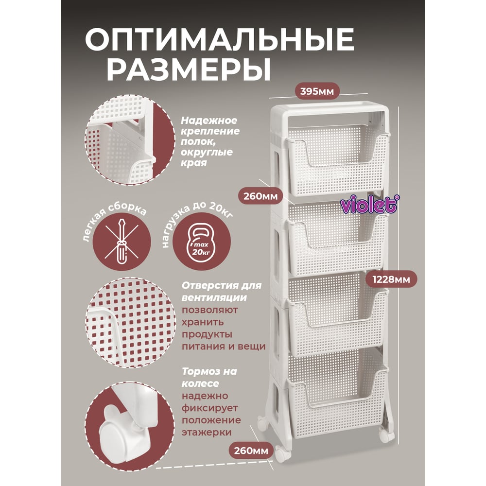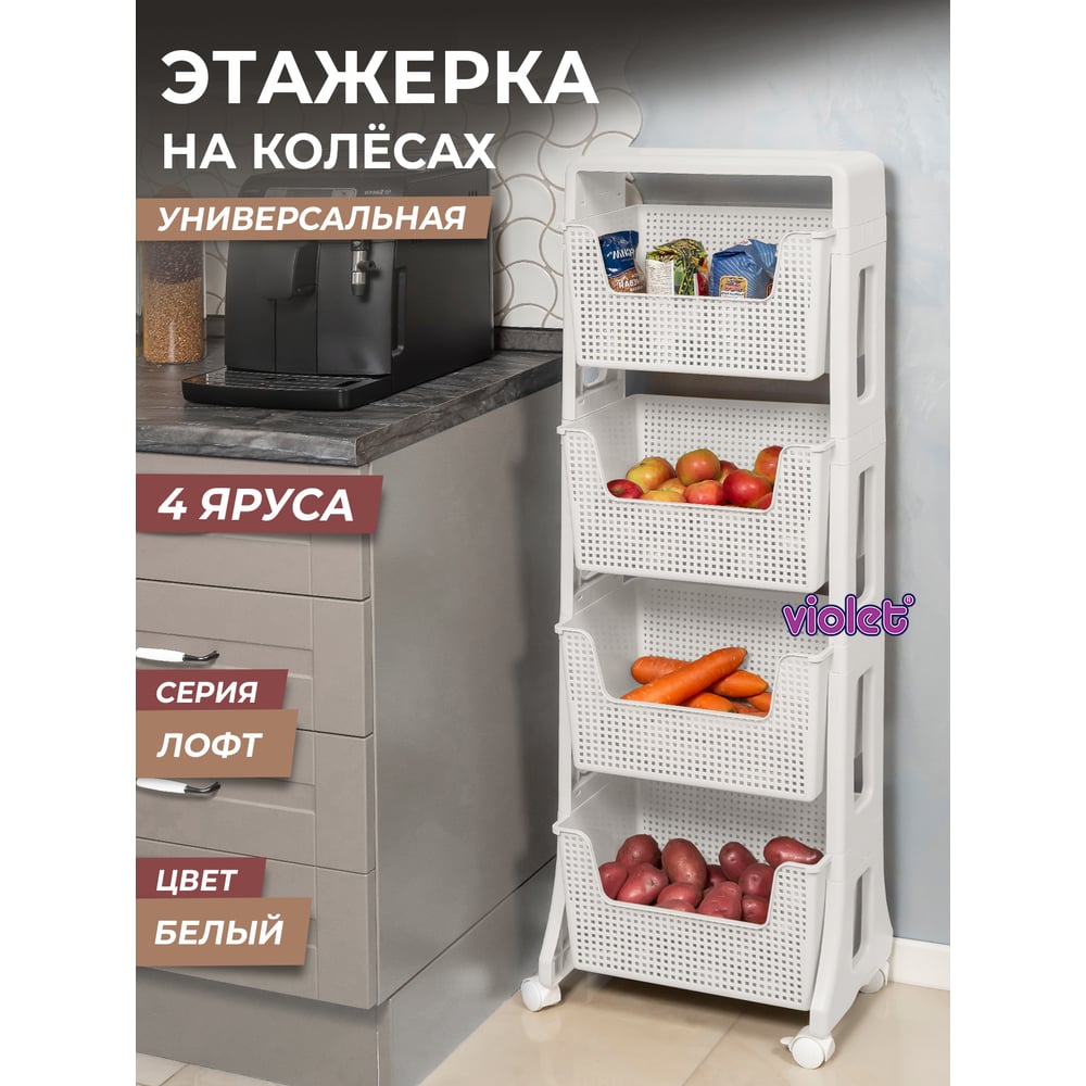Этажерка Violet Лофт напольная, 4-х ярусная, на колесах, белая 770406