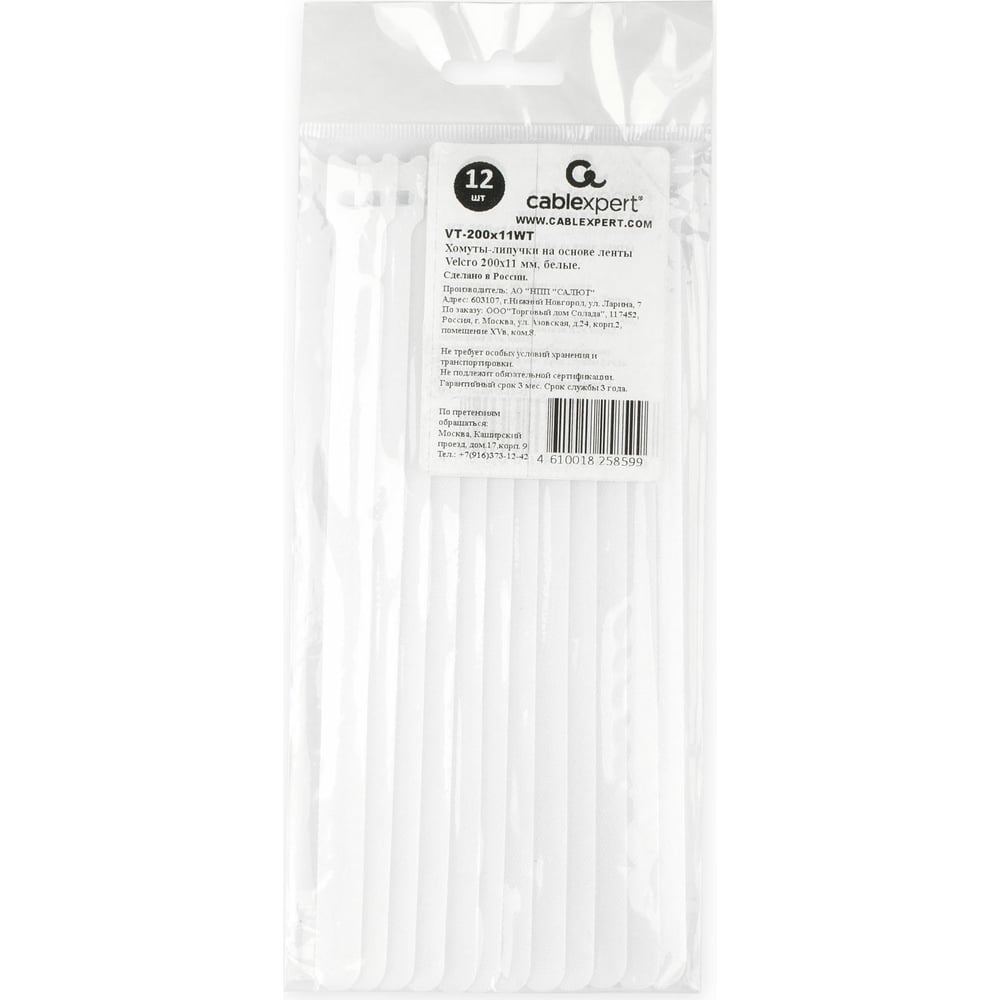 Хомуты-липучки на основе ленты Velcro Cablexpert 200x11 мм, белые, 12 шт. VT-200x11WT