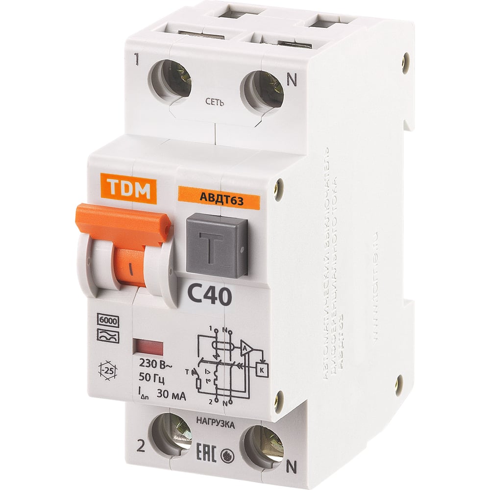 Автоматический выключатель дифференциального тока TDM ELECTRIC АВДТ 63 2P C40 30мА SQ0202-0006