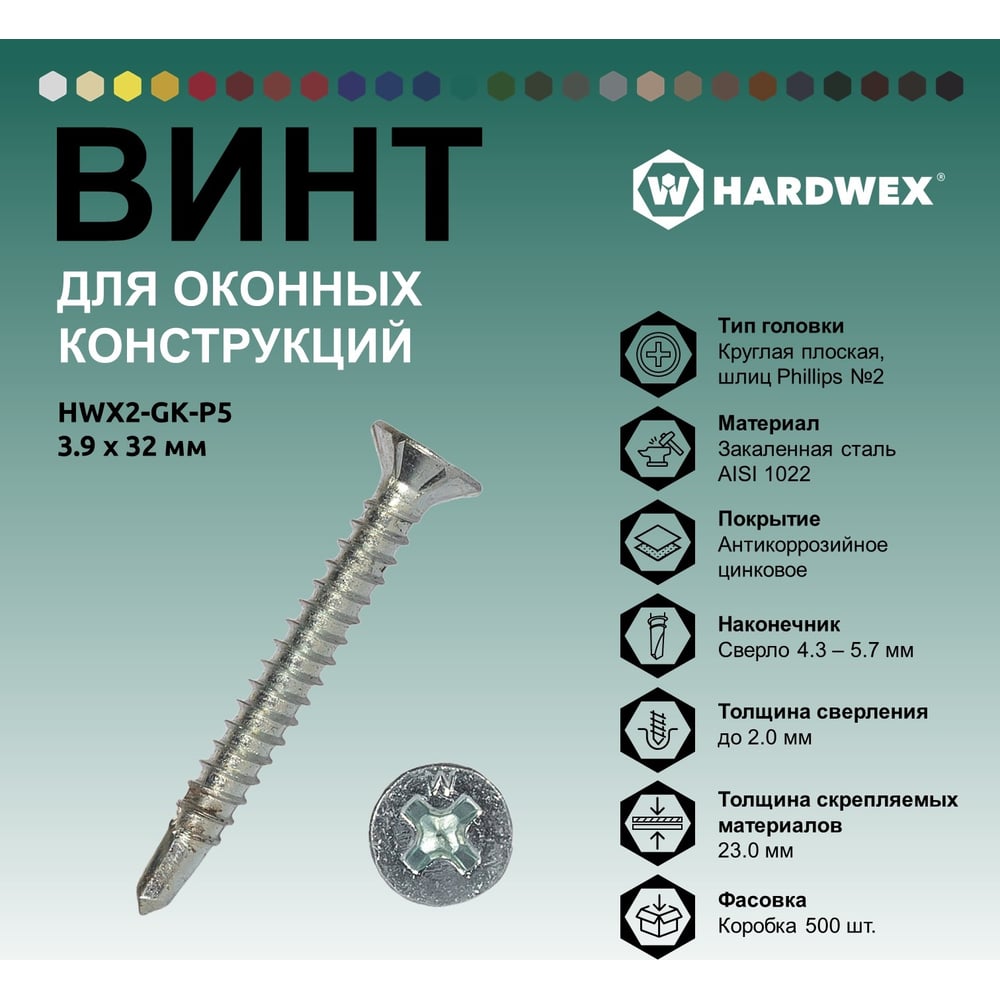 Саморез для оконных конструкций HARDWEX ТМ HWX2-GK-P5-3.9x32 мм, св.№3, Phillips №2, цинк, 500 шт. 3000000000588