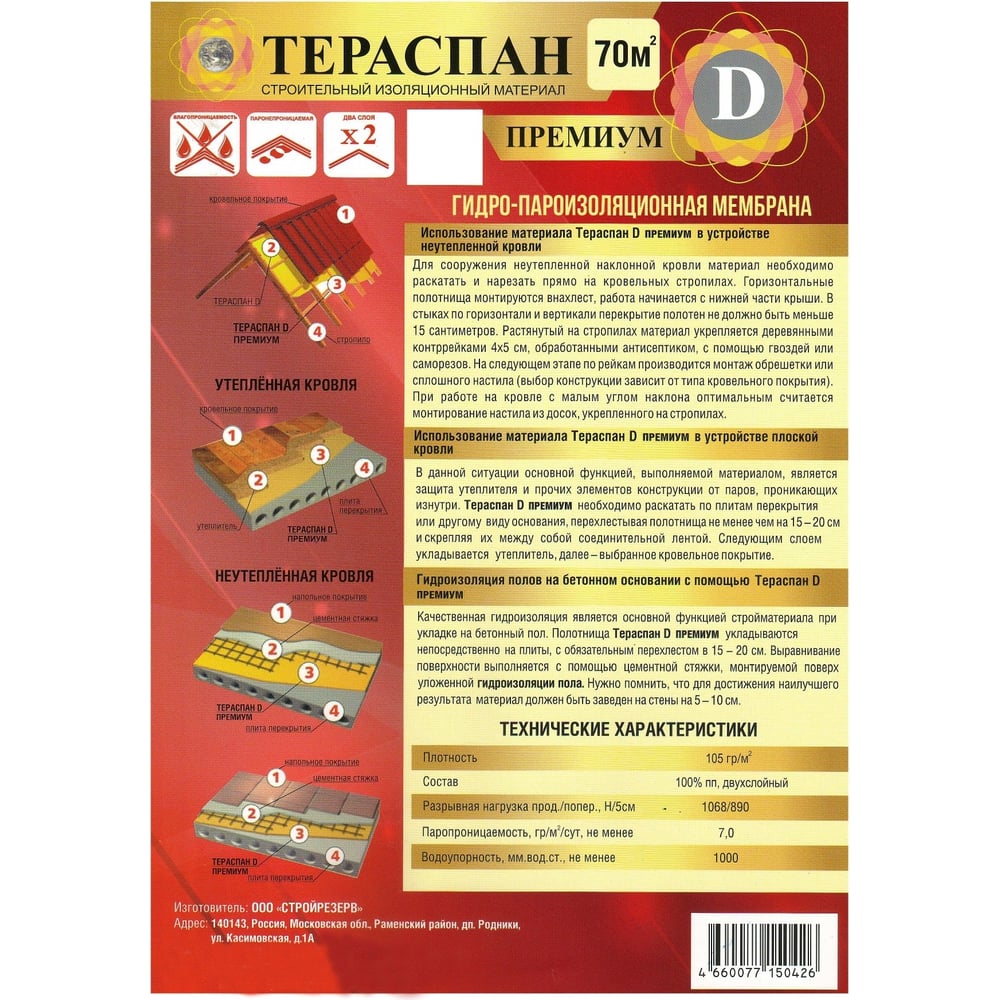 Двухслойный гидро-пароизоляционный материал ТЕРАСПАН Д ПРЕМИУМ повышенной прочности, 70 кв. м 4660077150426
