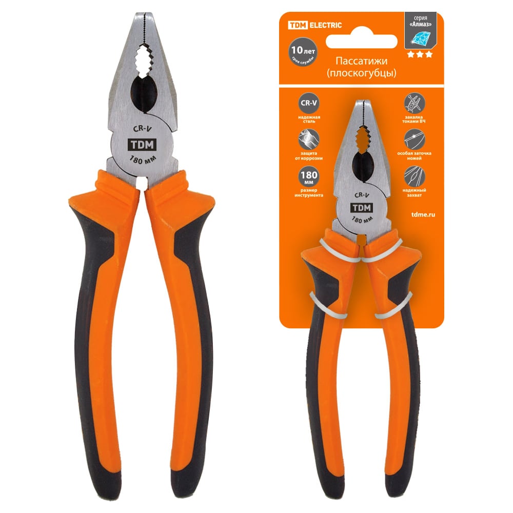 Пассатижи (плоскогубцы) TDM ELECTRIC с двухкомпонентными рукоятками, CR-V сталь, 180 мм, серия "Алмаз" SQ1010-0202
