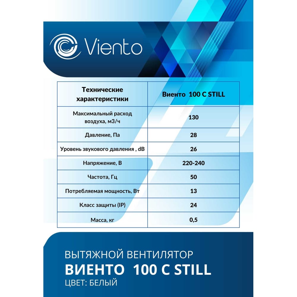 Осевой вытяжной вентилятор ВИЕНТО малошумный,130 м3, шарикоподшипник ВИЕНТО 100С STILL-B
