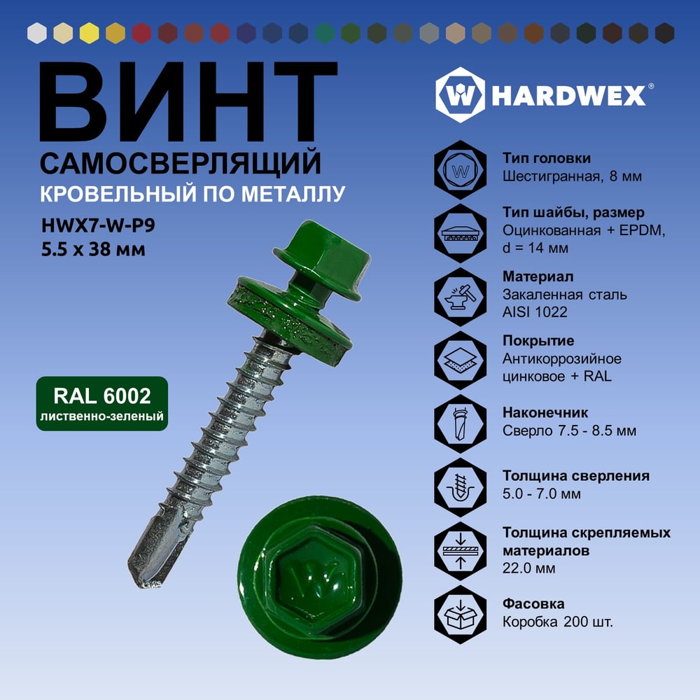 Саморез кровельный по металлу HARDWEX ТМ HWX7-W-P9-5.5x38 мм, св.№3, RAL 6002, 150 шт. 5190000240249