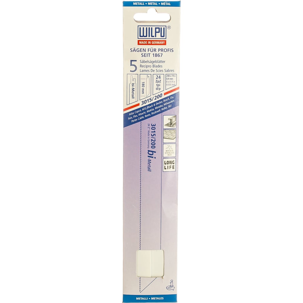 Полотно по металлу 3015/200 Bi-metall (5 шт; 200х19х0.9 мм; 180 мм; 24 TPI) WILPU 1422000005
