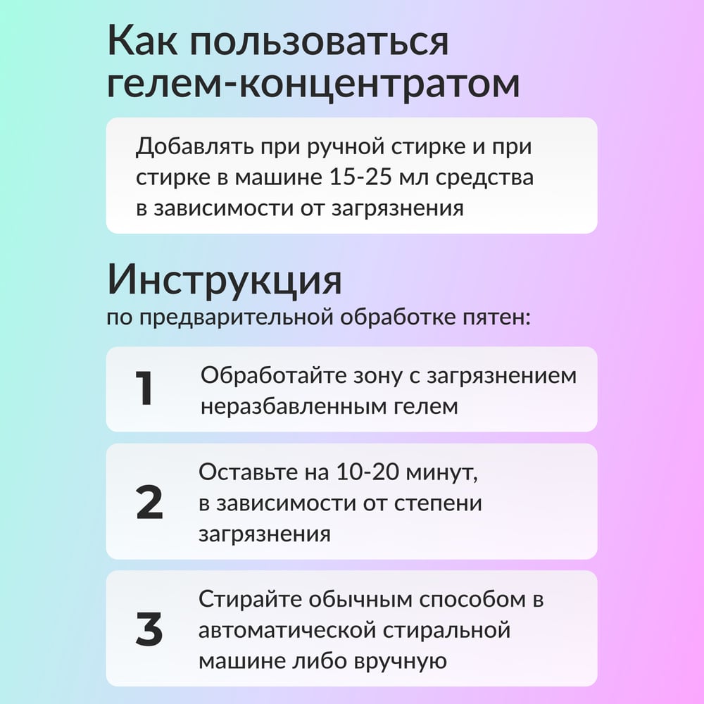 | Расход | загрузка белья/количество геля (для воды мягкой и средней жесткости): на 4 кг - 5 нажатий помпы, на 5 кг - 6 нажатий помпы, на 7 кг - 8 нажатий помпы |