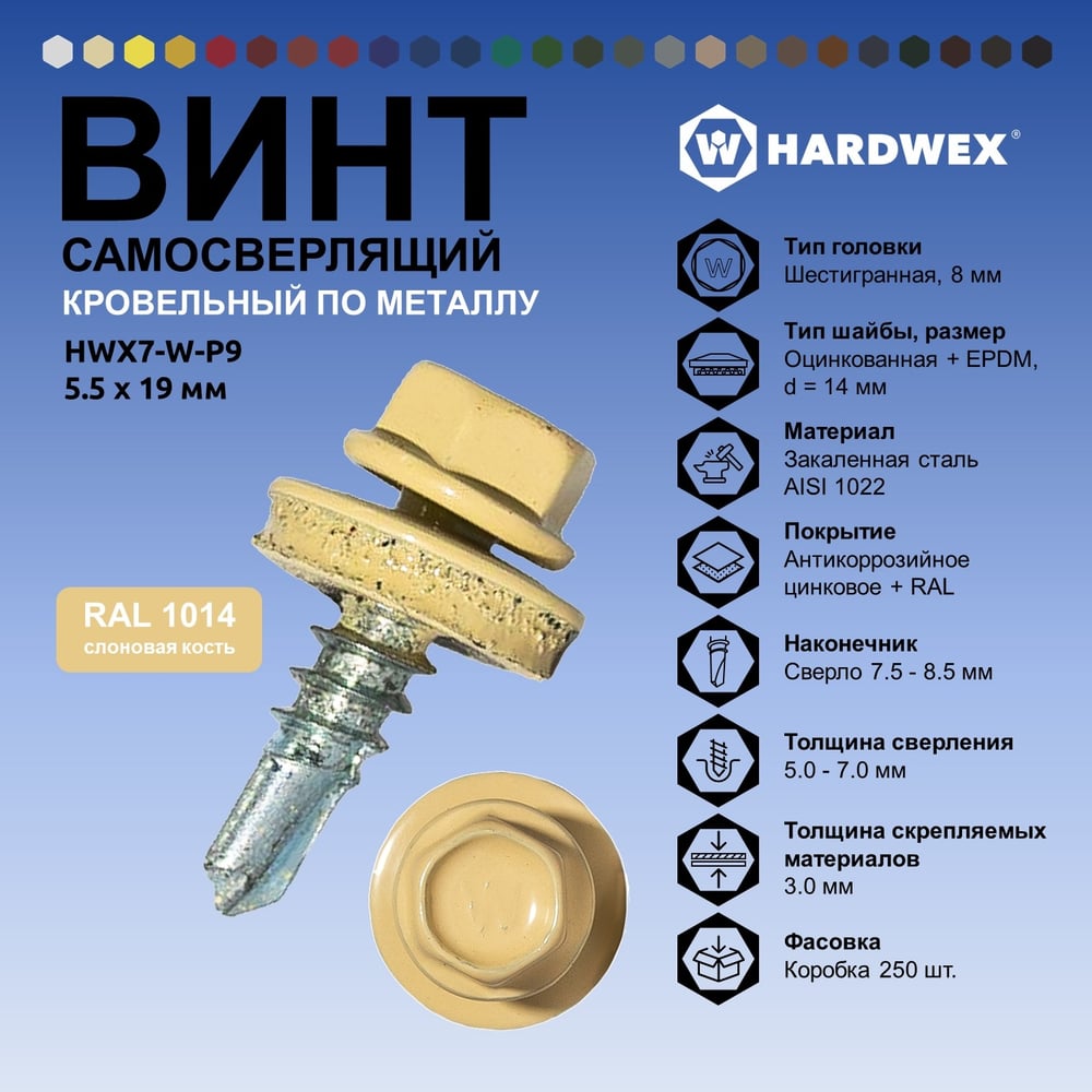 Саморез кровельный по металлу HARDWEX ТМ HWX7-W-P9-5.5x19 мм, св.№3, RAL 1014, 250 шт. 5190000023507