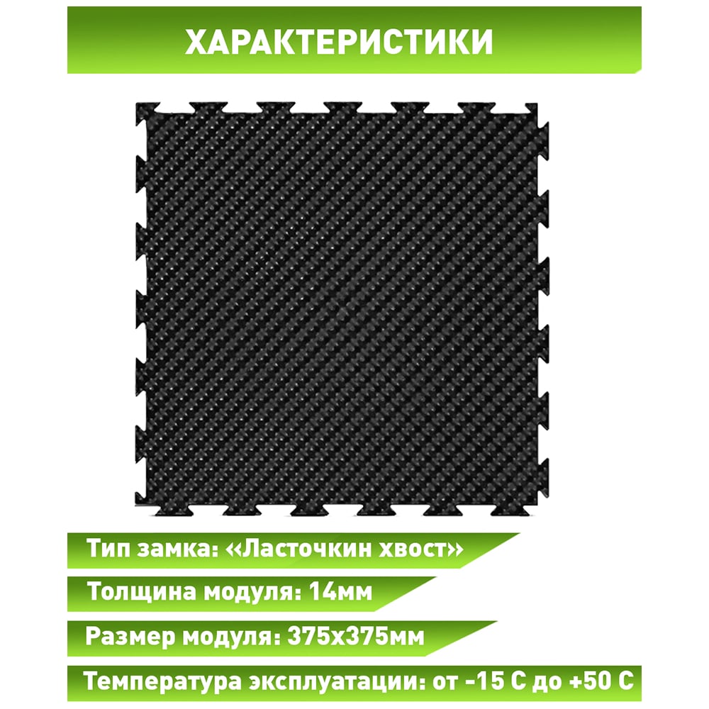 Длина 375 мм Ширина 375 мм Цвет черный Количество 12 шт Вес нетто 11.5 кг Толщина 10 мм Min температура эксплуатации -15 °С Max температура эксплуатации 50 °С Тип замка "ласточкин хвост" Палитра черный Материал основания ПВХ Твердость по Шору 70-77