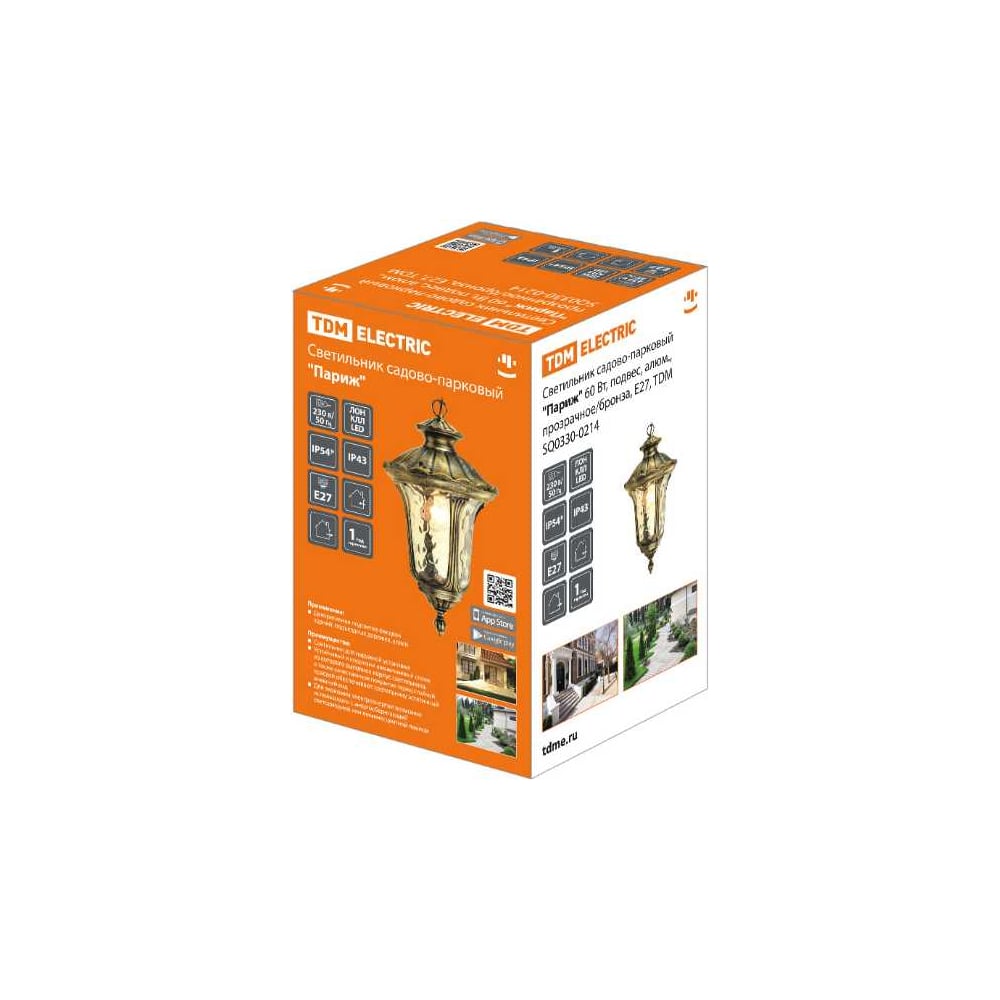Светильник уличный TDM ELECTRIC "Париж" 60 Вт, подвес, алюминий, прозрачное/бронза, Е27 SQ0330-0214