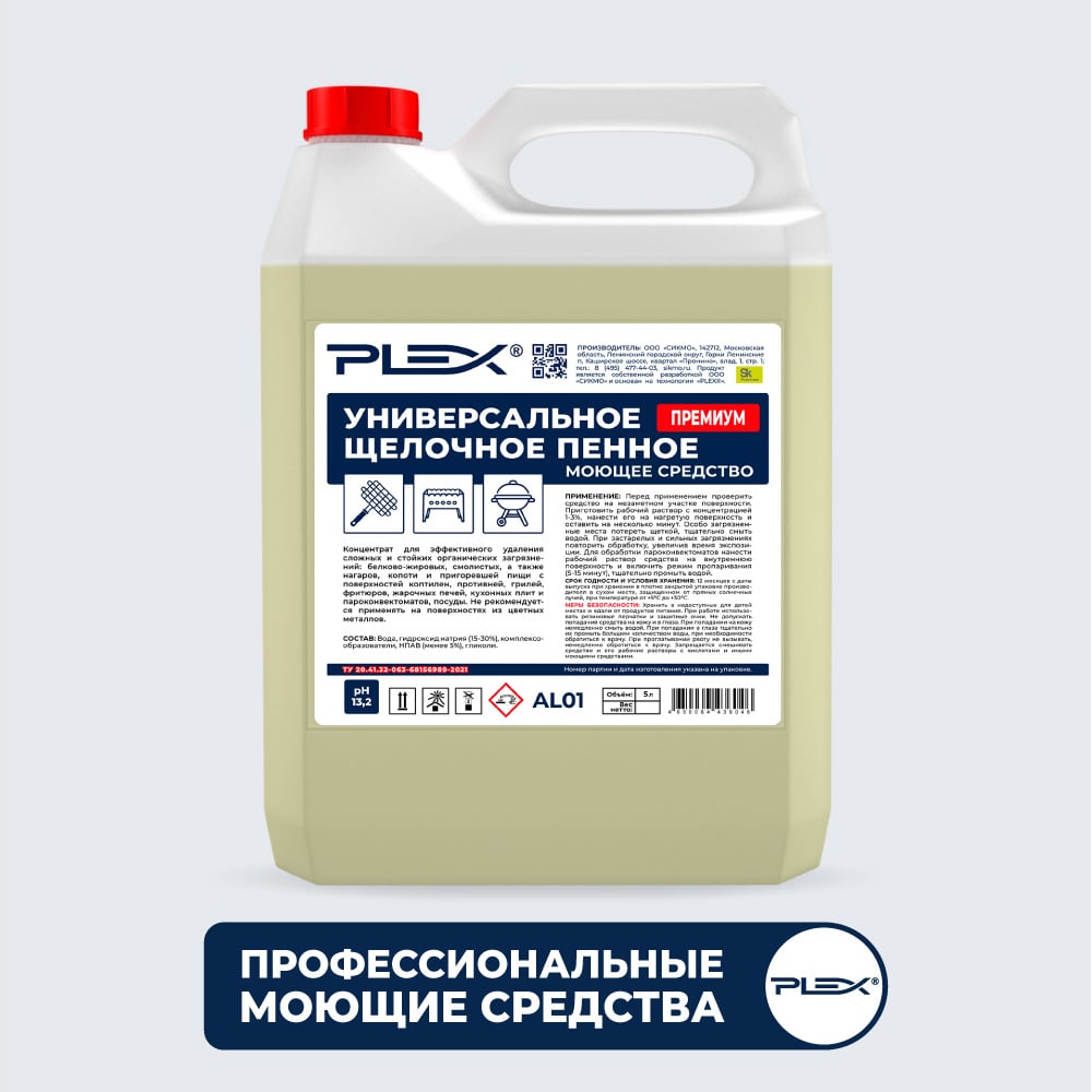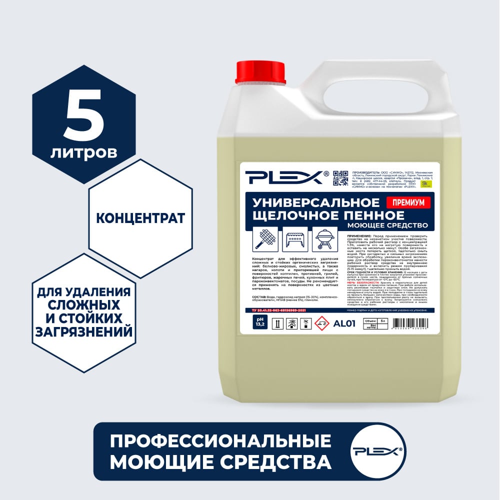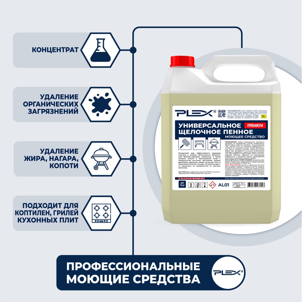 Средство-концентрат для удаления жира и нагара PLEX ПРЕМИУМ пенное, щелочное, 5 л УТ000007996