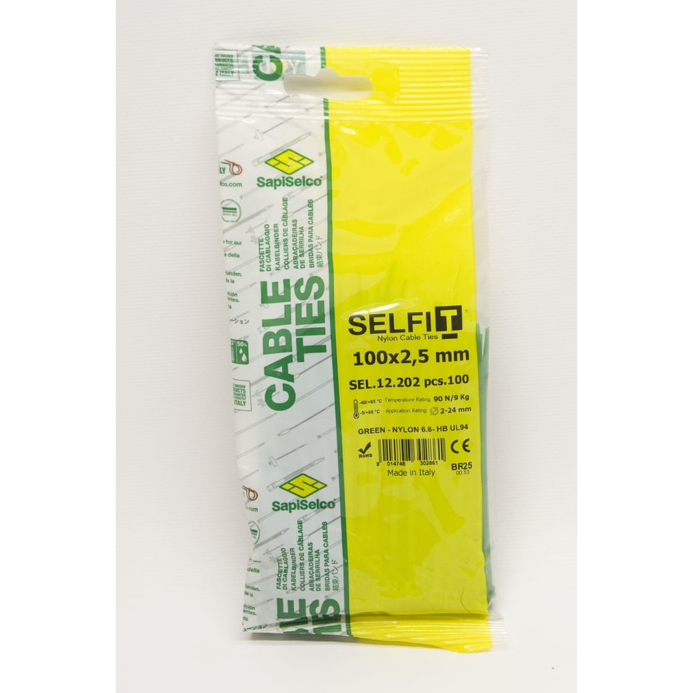 Стяжки SapiSelco зеленого цвета, 2.5x100 мм, полиамид 6.6, 100 шт. SEL.12.202R