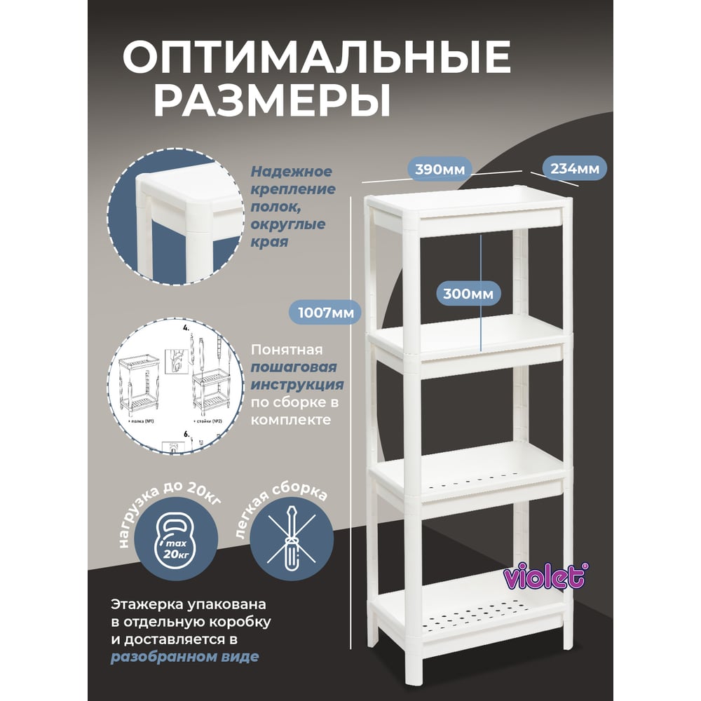 Этажерка Violet VIKEA широкая, 4-х ярусная, белая 781406