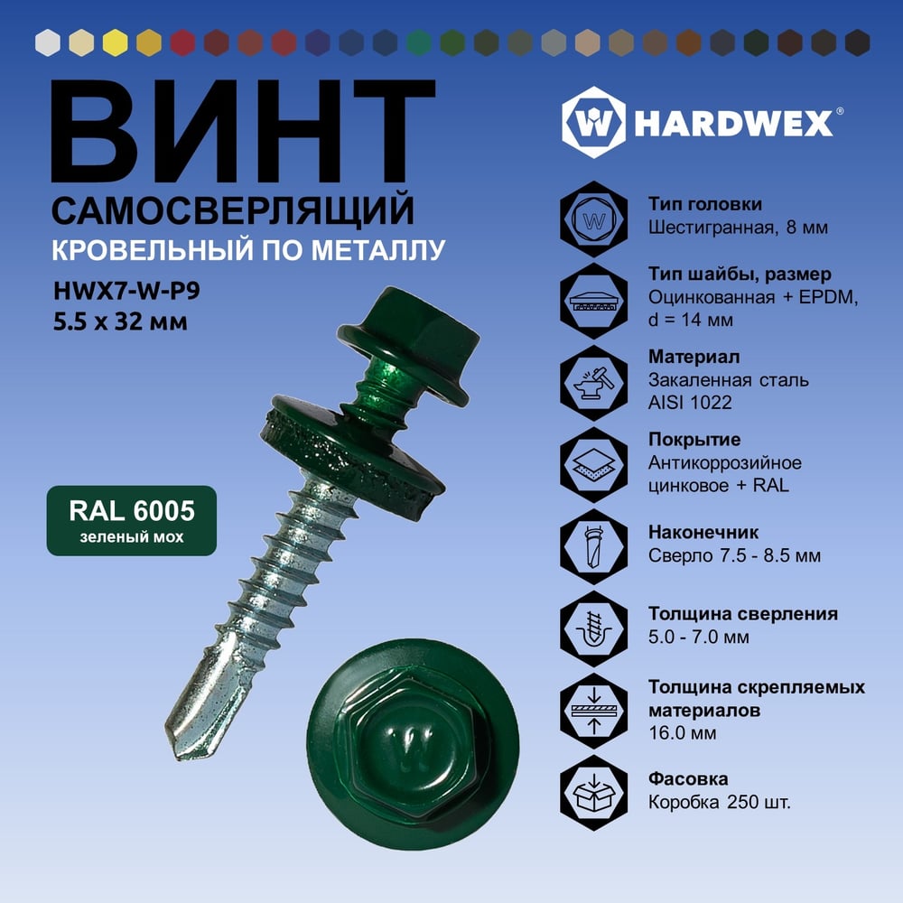 Саморез кровельный по металлу HARDWEX ТМ HWX7-W-P9-5.5x32 мм, св.№3, RAL 6005, 200 шт. 5190000239960