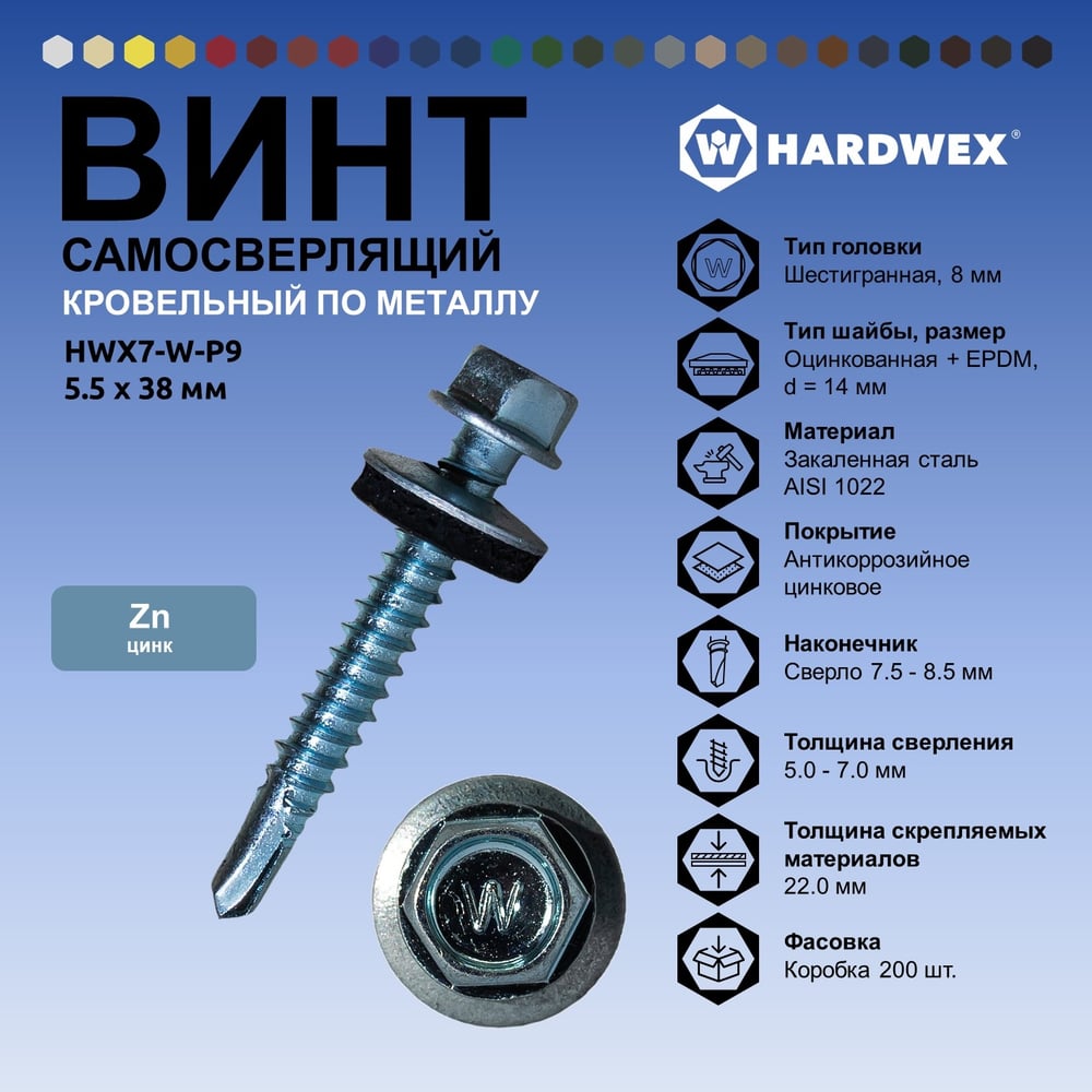 Саморез кровельный по металлу HARDWEX ТМ HWX7-W-P9-5.5x38 мм, св.№3, цинк, 150 шт. 5190000240096