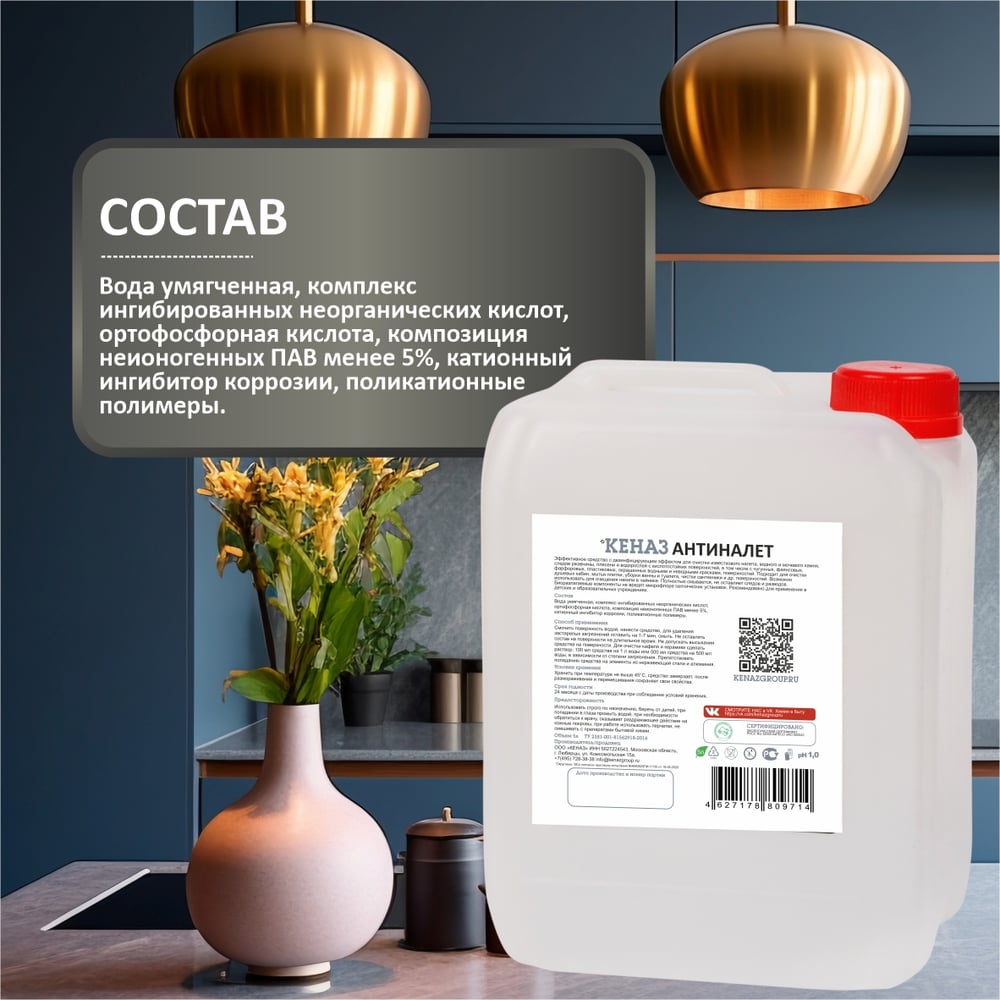 ≥30% очищенная вода, композиция неорганических кислот более 15%, в том числе соляная кислота, более 5% неиногенные ПАВ, ингибитор коррозии, ортофосфорная кислота, поликатионные полимеры более 1%. Сильнокислотное (рН 1,0).