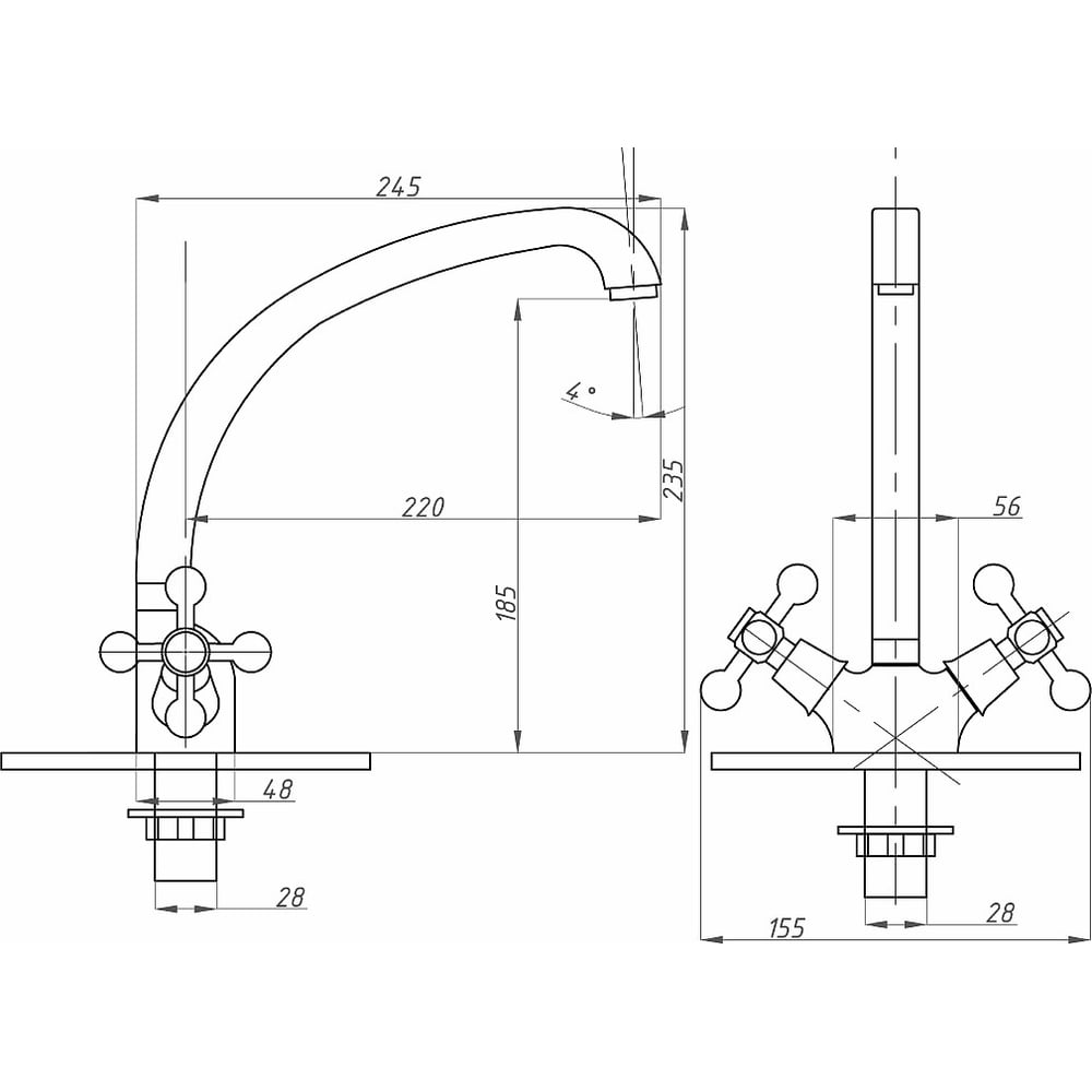 Покрытие глянцевое Цвет хром Тип установки настольный Стиль современный Материал корпуса сплав цинк, медь, алюминий Поворотный излив да Назначение для кухни Тип крепления на гайку Гибкий излив нет Длина излива 220 мм Высота смесителя 235 мм Лейка нет Термостат нет Встраиваемый нет Подводка в комплекте нет Аэратор да Переключатель на фильтр нет Тип смесителя двухрычажный Форма излива воды традиционная Запорный клапан керамическая кран-букса Форма смесителя округлая Выдвижной излив нет Излив есть Складной нет С щеткой нет Двойной излив нет Размер крепления G1/2 Направление струи под углом Диаметр отверстия в раковине 28 мм Расположение термостата без термостата
