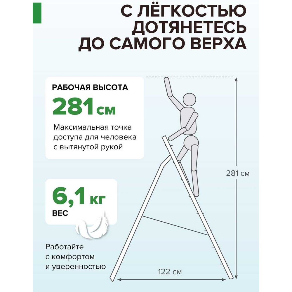 Габариты без упаковки 2027х720х189 мм Материал алюминий Вид односторонняя Тип стремянка Класс товара Профессиональный Вес нетто 6 кг Высота площадки 2.81 м Широкие ступени да Лоток для принадлежностей нет Размер в сложенном состоянии 202.7х72х18 см Рабочая высота 2.78 м Max рабочая нагрузка 150 кг Общая длина 2.027 м Кол-во ступеней по одной стороне 6 шт Ширина ступеней 680 мм Ширина лестницы 716 мм min длина в сложенном состоянии 2.027 м Количество ступеней 6 шт Телескопическая/выдвижная нет Телескопическая нет Анодированная нет С развальцованными ступенями нет Для разноуровневых поверхностей нет