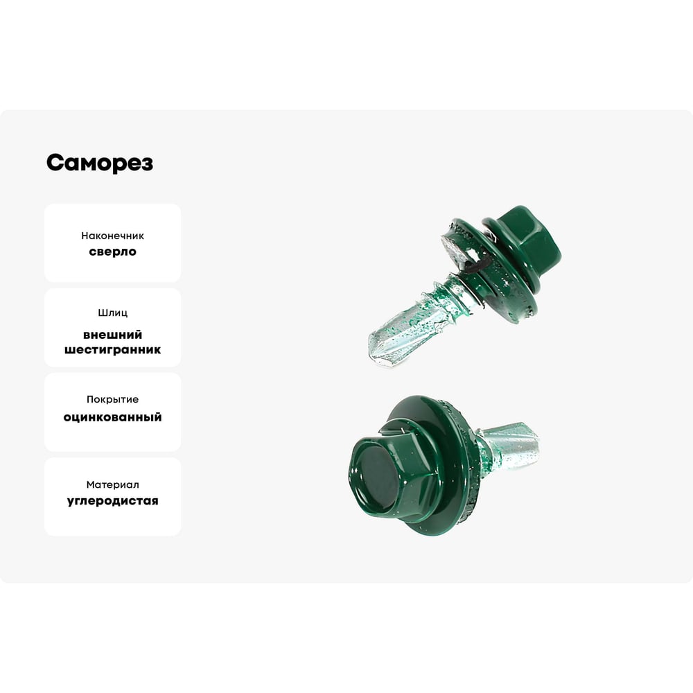 Длина 25 мм Тип фасовки кг Материал углеродистая сталь Покрытие оцинкованный Диаметр 5.5 мм Назначение для деревянных и металлических оснований ISO нет ГОСТ нет Наличие пресс-шайбы есть Нержавеющая сталь да Цвет покрытия без покрытия Форма головки шестигранная Шлиц внешний шестигранник Наконечник сверло Цвет RAL RAL 6005 (зеленый мох) Фасовка 5 кг