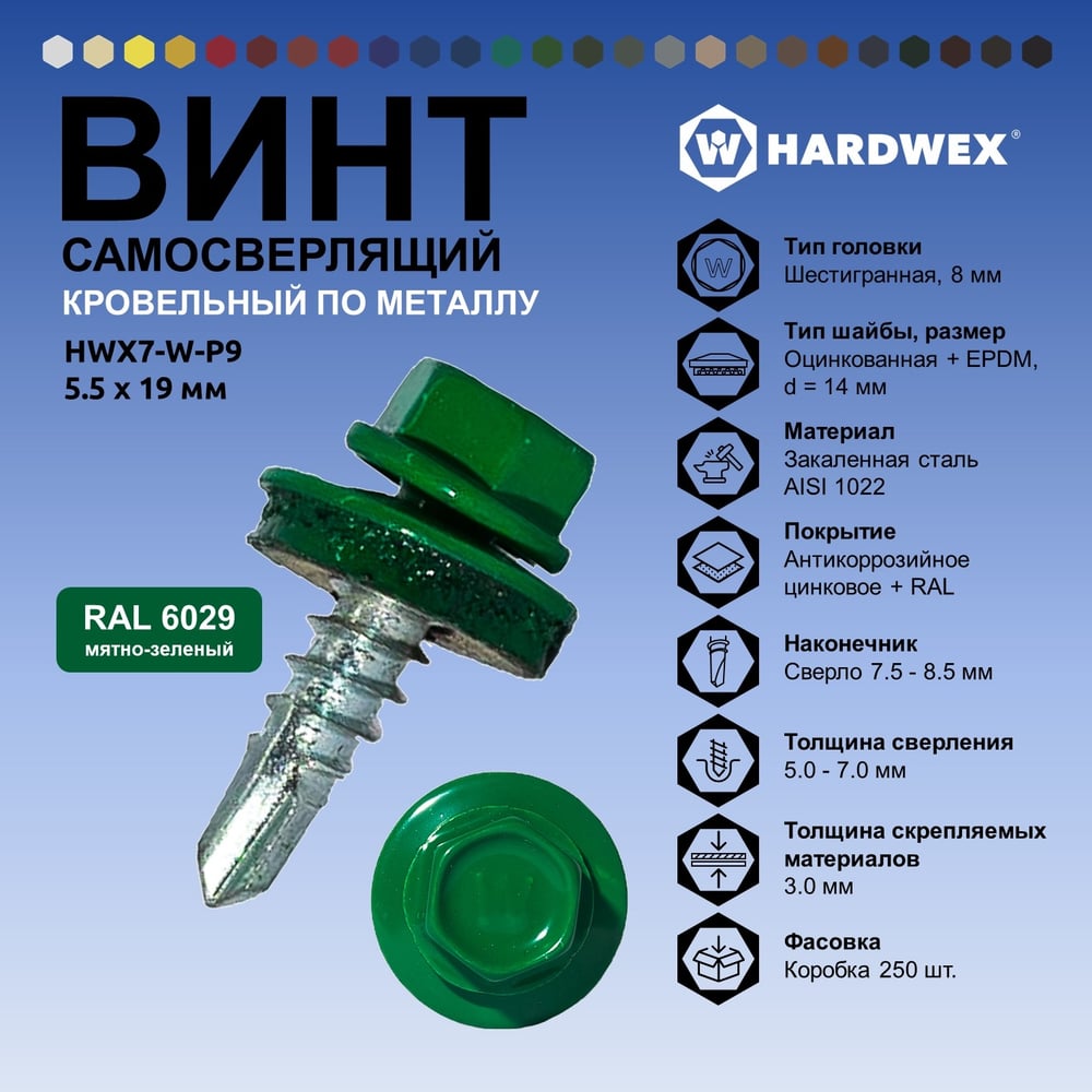 Саморез кровельный по металлу HARDWEX ТМ HWX7-W-P9-5.5x19 мм, св.№3, RAL 6029, 250 шт. 5190000023651