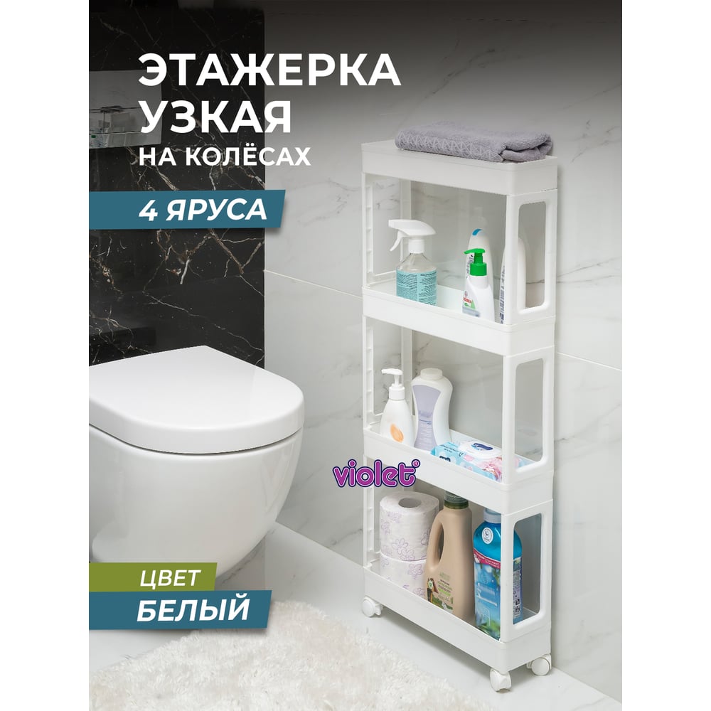 Узкая этажерка Violet 4-х ярусная, на колесах, белая 760406