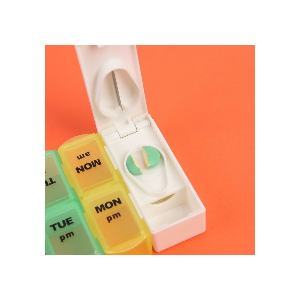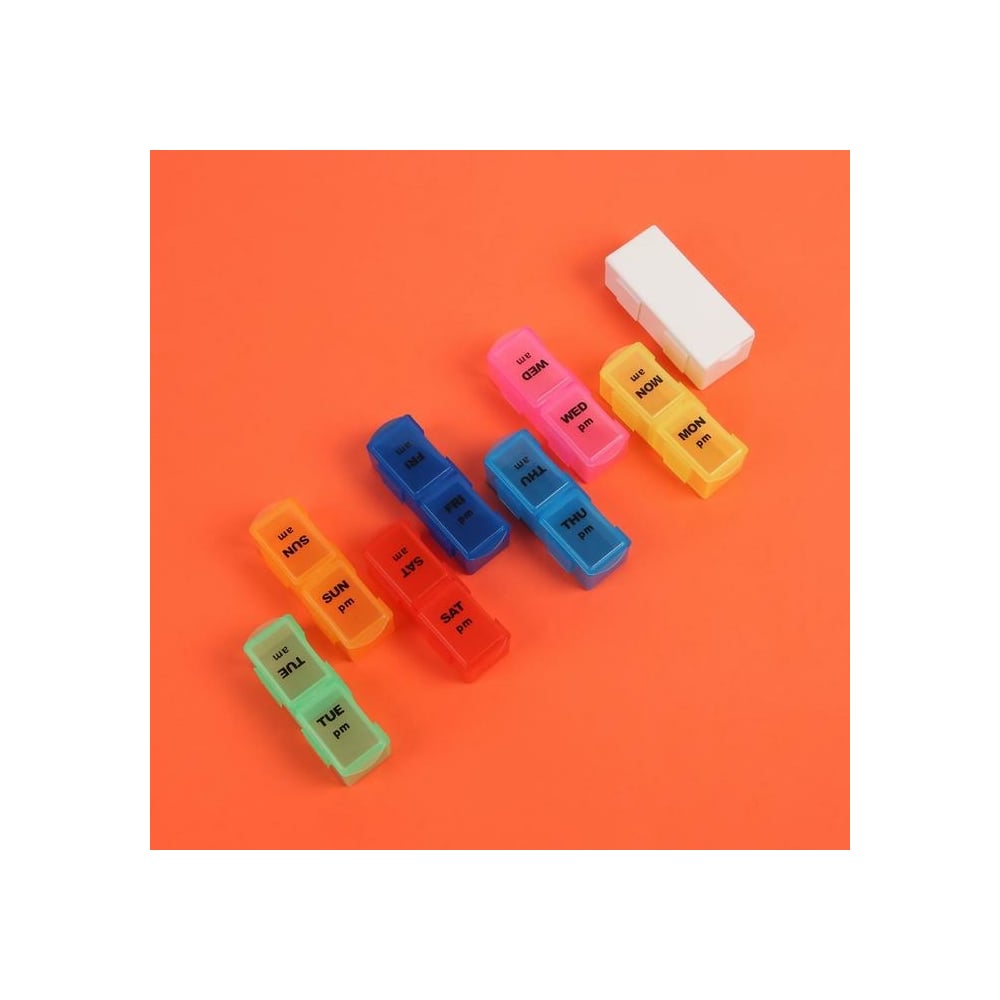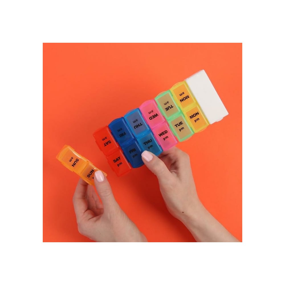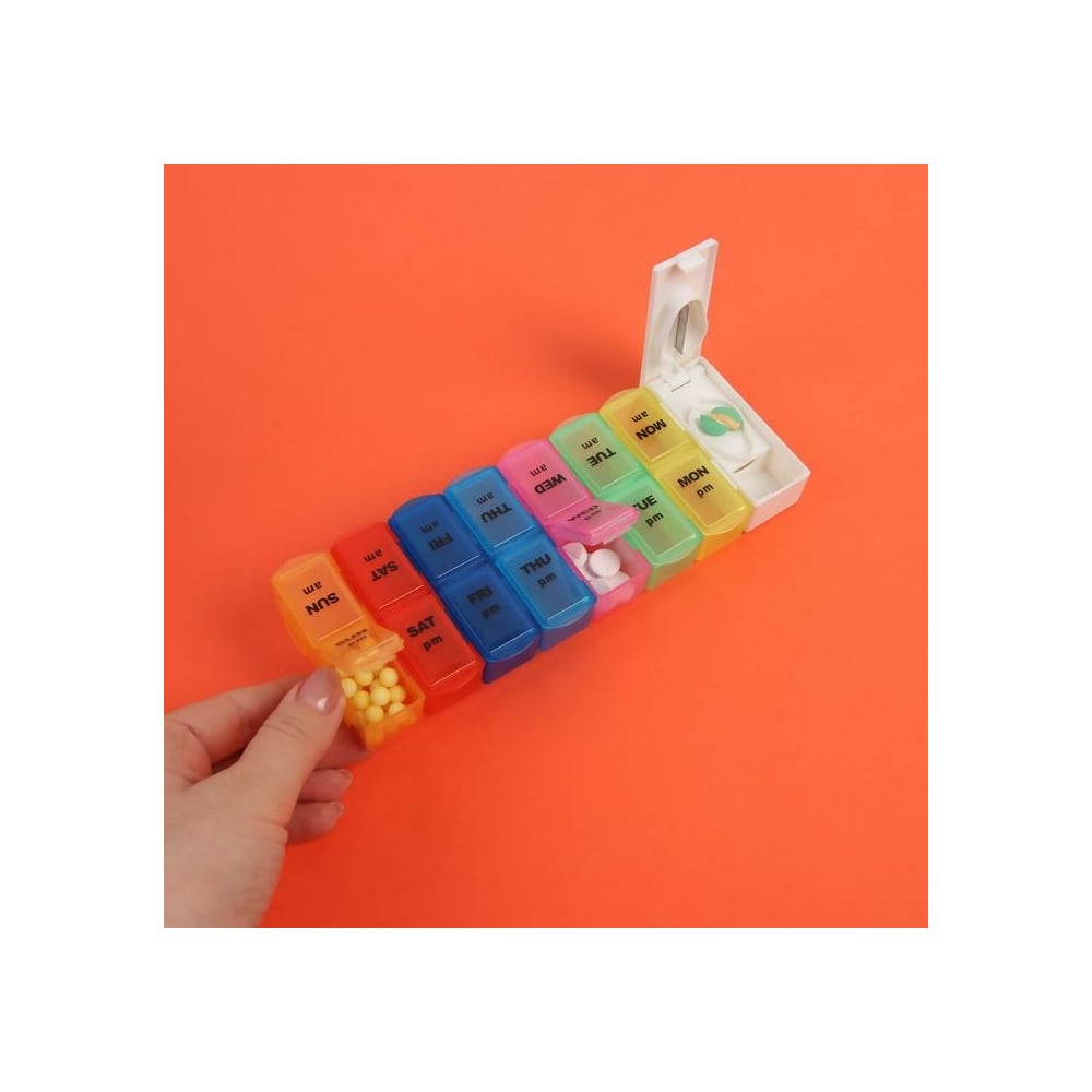 Таблетница-органайзер Onlitop 7 контейнеров по 2 секции 20х7,5х2,5 см Неделька утро/вечер с таблеторезом англ буквы цв накл ОТ 1528843
