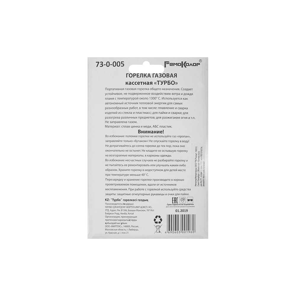 Газовая горелка для пайки и сварки РемоКолор Турбо, кассетная, заправка бутаном С4Н10 73-0-005