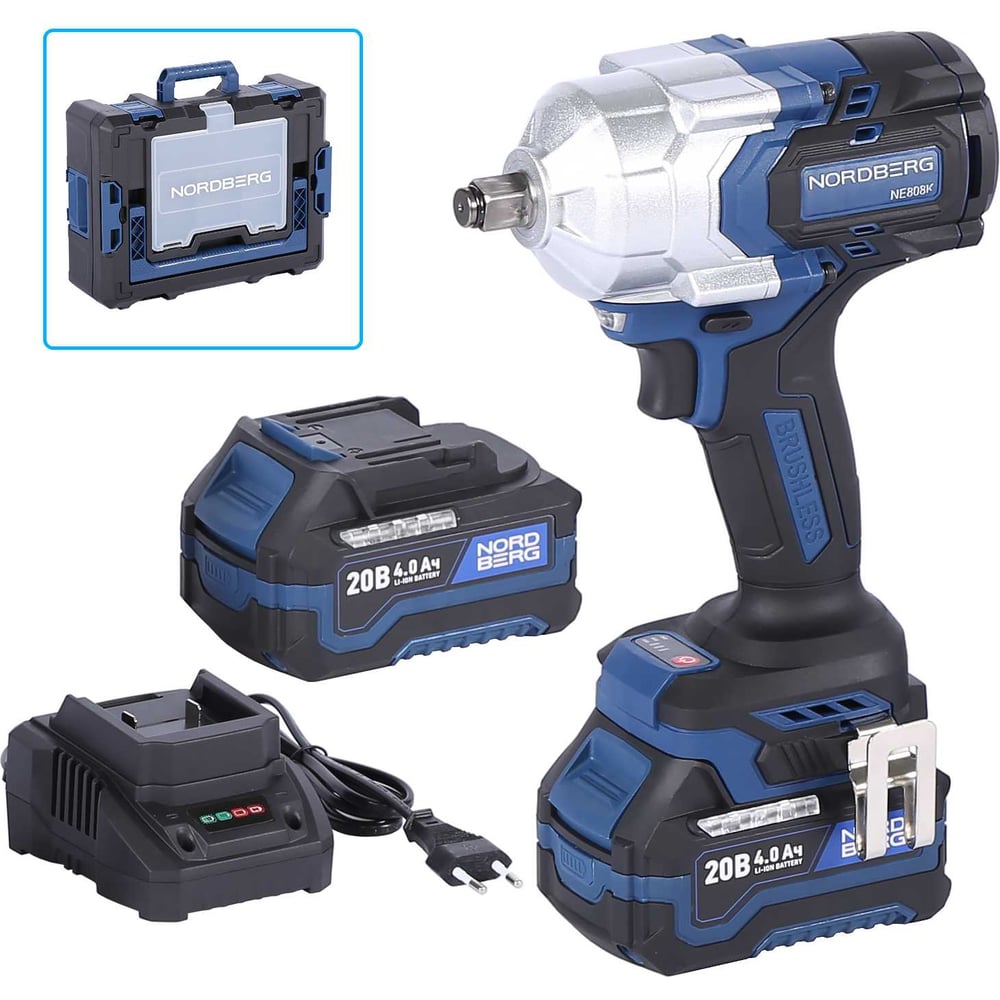 Аккумуляторный гайковерт NORDBERG 1/2", 21В, 1000 Нм с двумя 4A акк. и зар. уст-вом 1,8A, в кейсе NE808K