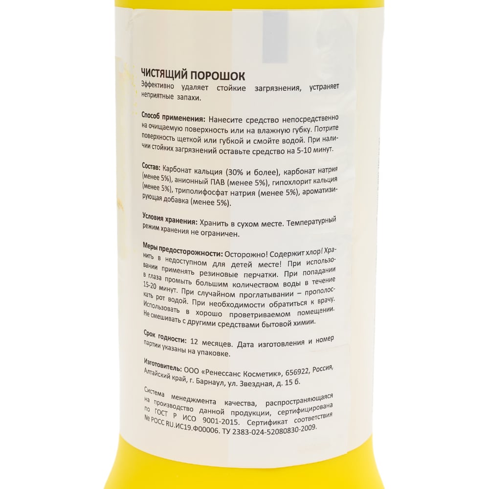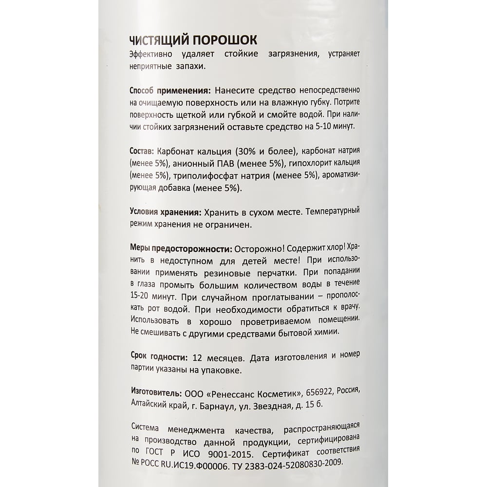 | Состав | Карбонат кальция (30% и более), карбонат натрия (менее 5%), анионный ПАВ (менее 5%), гипохлорит кальция (менее 5%), триполифосфат натрия (менее 5%), ароматизирующая добавка(менее 5%). |