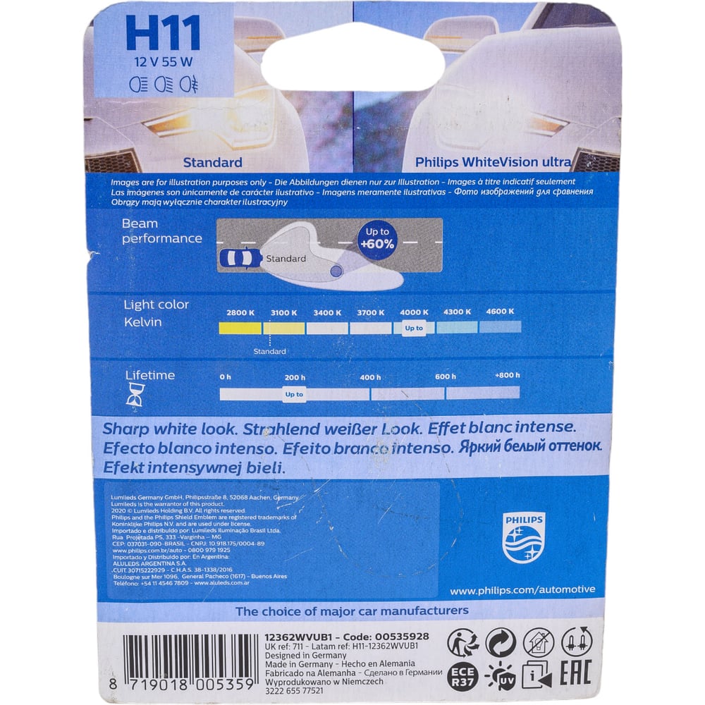 Автолампа PHILIPS H11 55 PGJ19-2 WhiteVision ultra 4000K 12V 12362WVUB1 890124