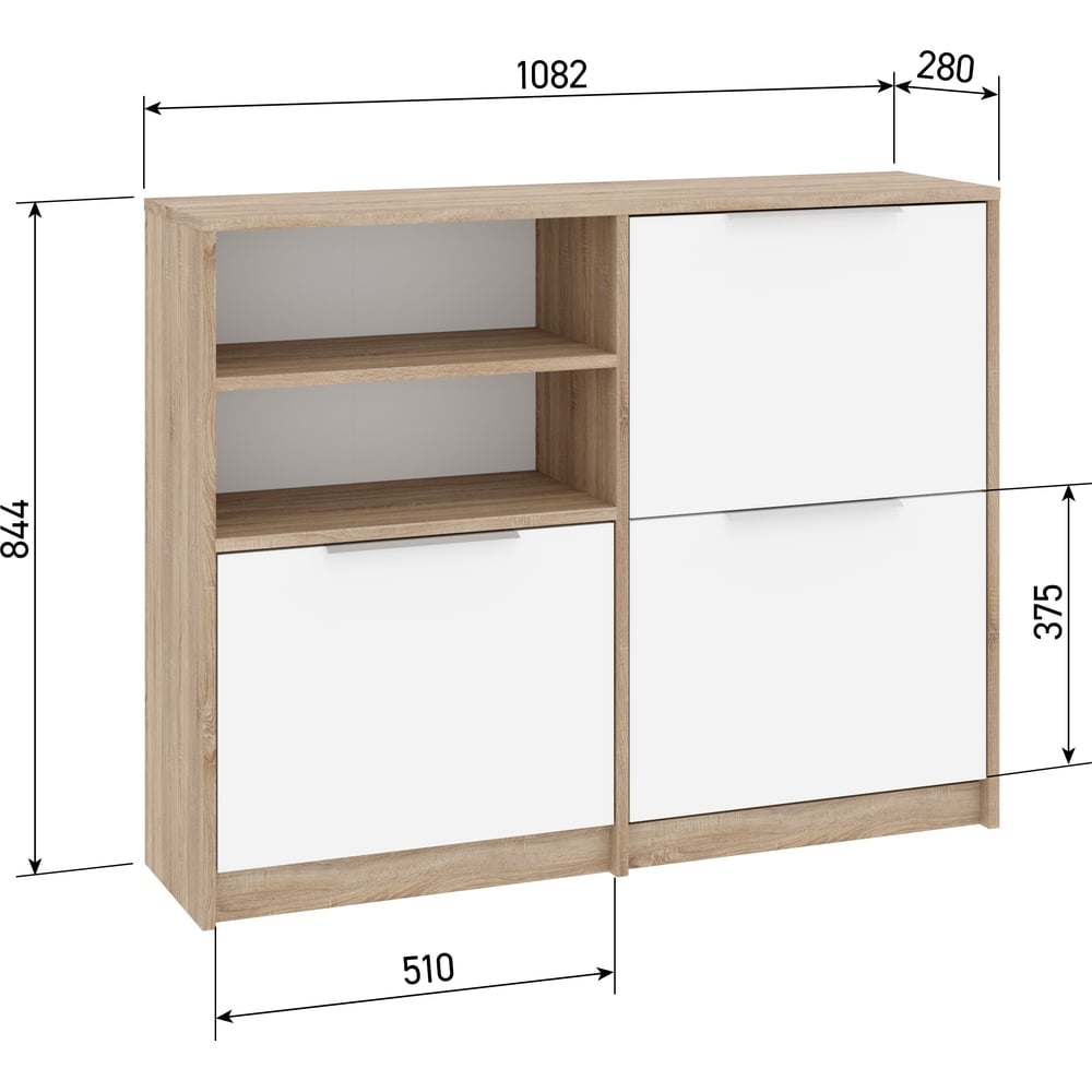 Габариты без упаковки 1082x850x280 мм Высота 850 мм Ширина 1082 мм Вес нетто 25 кг Зеркало нет Глубина 280 мм Количество полок 7 шт Закрытая есть Количество ящиков 3 шт Материал каркаса ЛДСП Наличие колес нет С сиденьем нет Цвет каркаса дуб сонома Покрытие фасадов матовое Цвет полок/фасада белый Тип обувницы тумба Материал полок/фасада ЛДСП