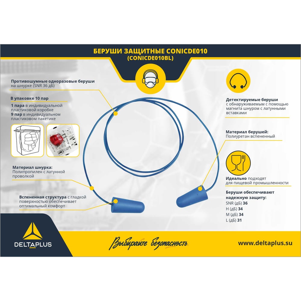 Детектируемые беруши из полиуретана Delta Plus CONICDE010 (SNR 36 DB) CONICDE010BL