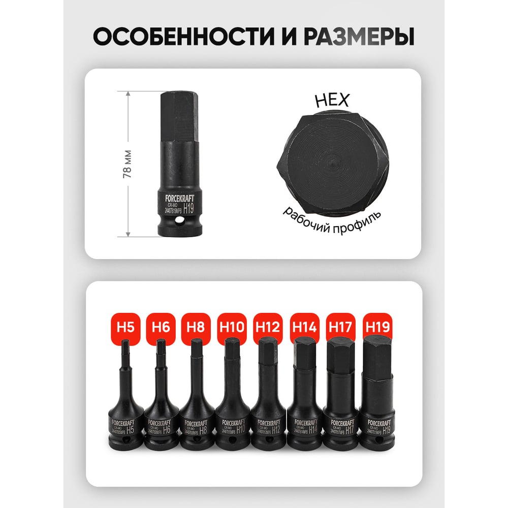 Набор головок-бит Forcekraft 6-гранные, ударные, 8пр FK-4087MPB(27087)