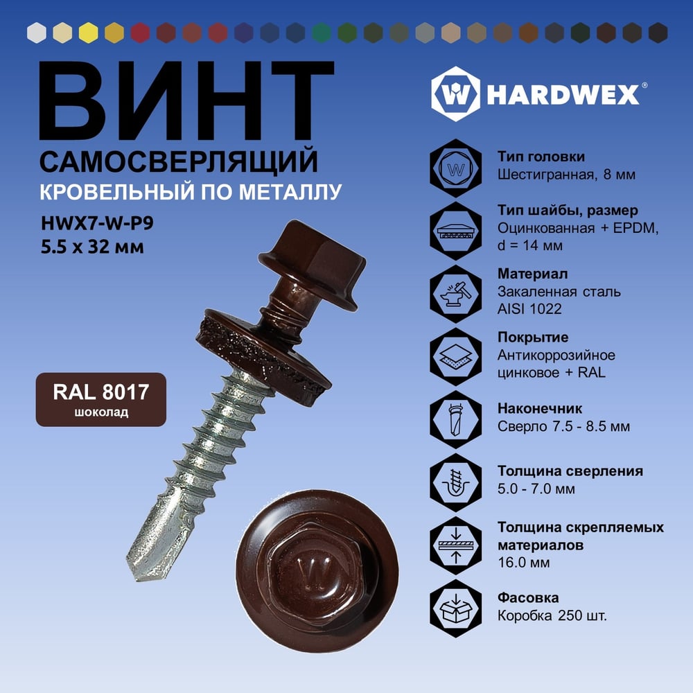 Саморез кровельный по металлу HARDWEX ТМ HWX7-W-P9-5.5x32 мм, св.№3, RAL 8017, 200 шт. 5190000240034