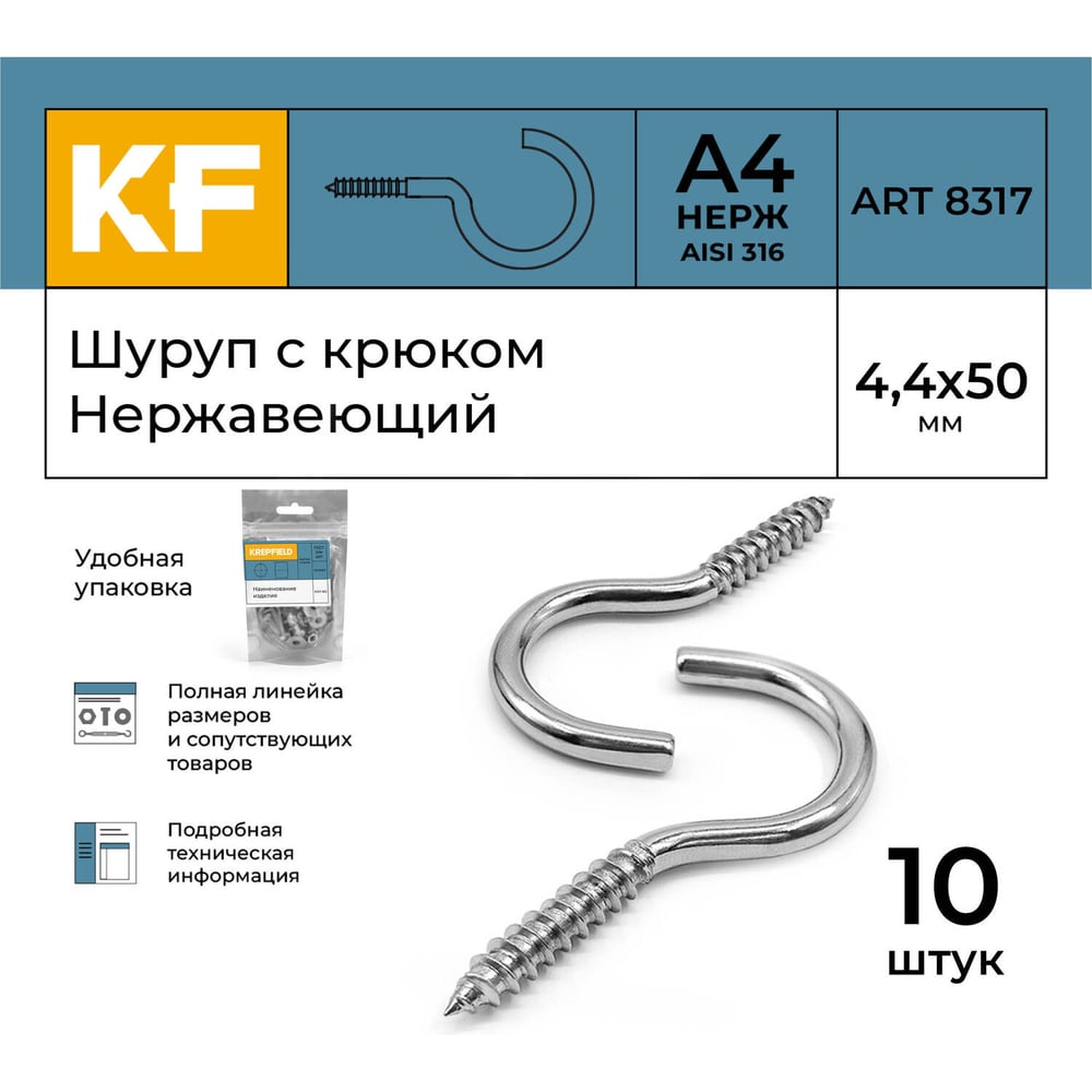Нержавеющий шуруп с крюком KREPFIELD 4,4x50 мм, ART 8317, А4, 10 шт. 8317А4ШУРУПСКРЮКОМ4,4X50-10