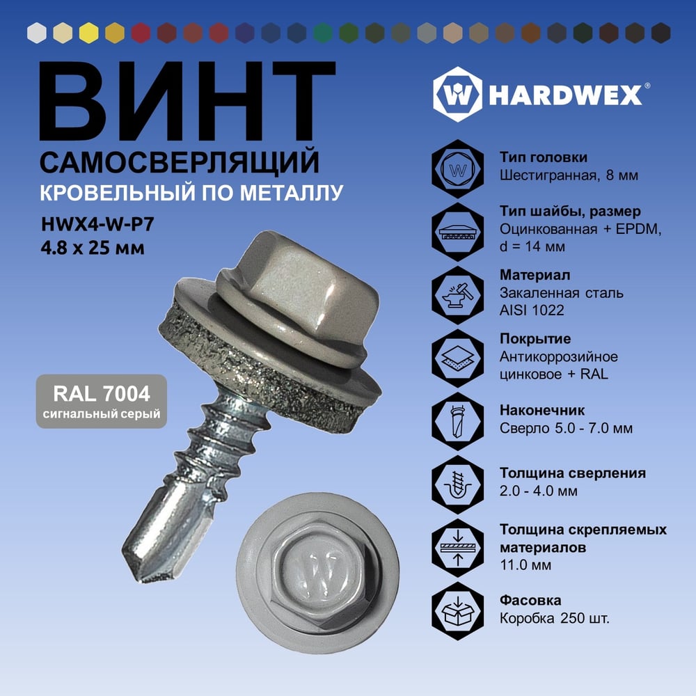 Саморез кровельный по металлу HARDWEX ТМ HWX4-W-P7-4.8x25 мм, св.№3, RAL 7004, 250 шт. 5190000001536