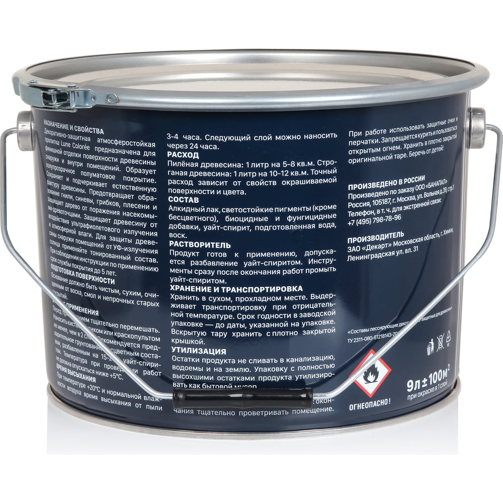 | Состав | Алкидный лак, биоцидные и фунгицидные добавки, уайт-спирит, светостойкие пигменты, подготовленная вода, воск. |