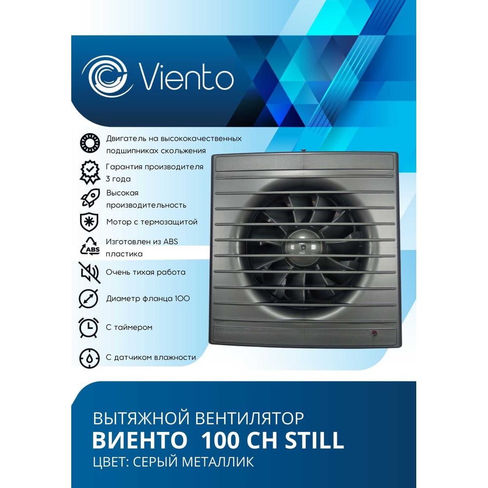 Осевой вытяжной вентилятор ВИЕНТО с таймером и датчиком влажности, малошумный, 130 м3, gray metal, шарикоподшипник ВИЕНТО 100СН STILL gray-B